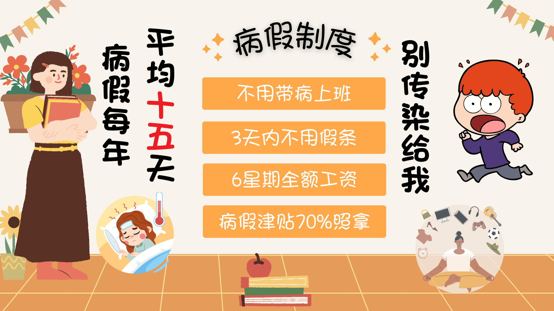 此外,在德国也没有人会逼着你“带病上班”,他们普遍认为,工作是为了更好的生活,而不是要把身体榨干,更没有人会把“生病硬扛”当成美德,反而会劝你赶紧回家好好休息,别把疾病传染给我这类对于外国人来说非常奇特的想法。要知道,三天之内的病假甚至连医生的假条都不需要就可以直接在家养病。只要病假不超过六个星期,你都能拿到全额工资。而根据德国联邦统计局 2023 年数据显示,德国人平均每年会请 15.1 个工作日的病假。所以如果你不幸生病,安心在家休息就是了,完全不用对带薪病假有任何内疚感。当然,如果病情实在严重,在六个星期后还会有医疗保险支付你大约 70% 工资的病假津贴,从而让人完全没有后顾之忧。