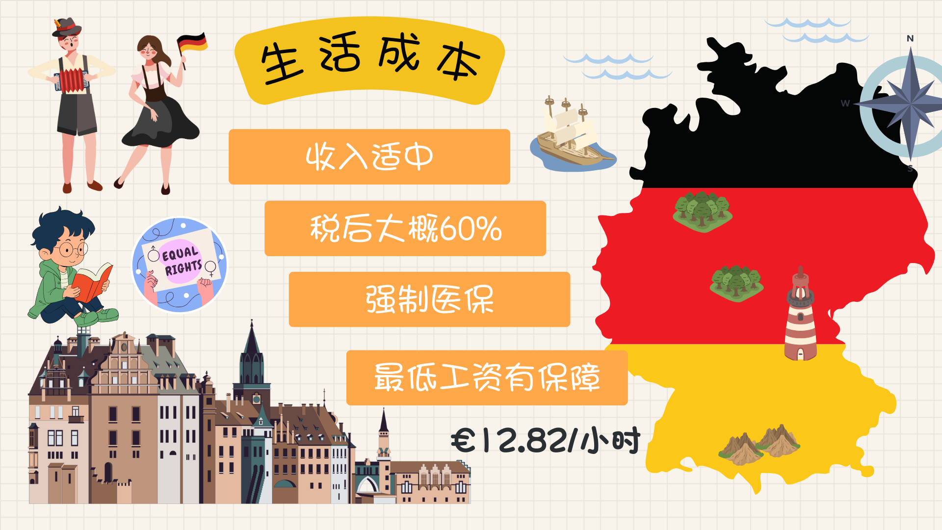 德国的工资虽然不像美国那样高得吓人,税后收入大概为税前的60%左右,但是由于物价相对平稳,加上医疗保险是强制缴纳,整体生活压力其实并不大。自2025年1月起,德国的最低工资为每小时 12.82 欧元。即便是留学生,在业余时间打打零工、做点实习或兼职也是有保障的。这主要得益于德国社会比较平等,整体基尼系数保持在一个稳定状态,不存在特别明显的“贫富差距”现象。因此只要努力工作,日子过得就不会太差。