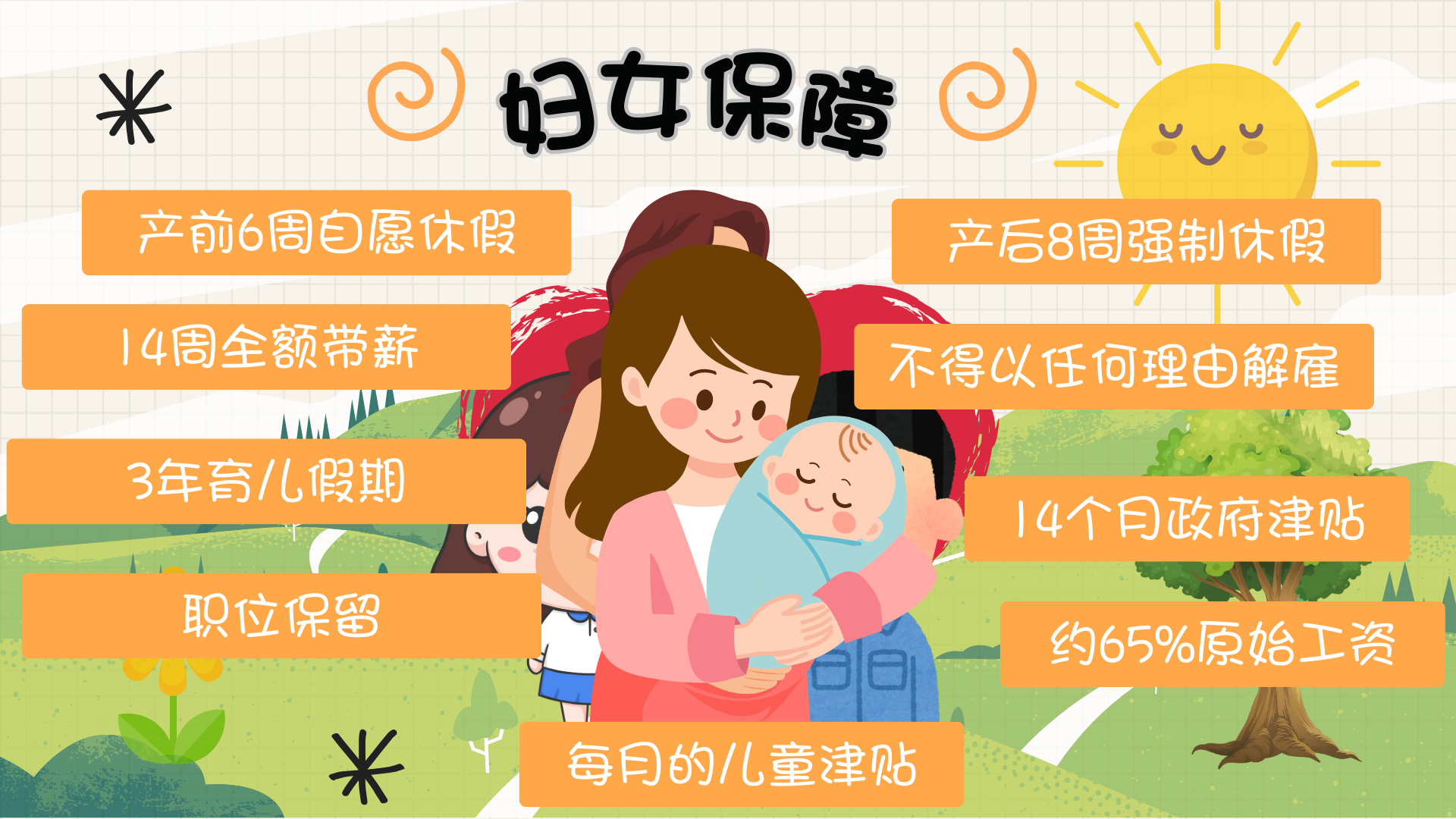 另外如果你是女性或者准备组建家庭,德国的生育和育儿制度也非常友好。妇女在怀孕期间,除非孕妇明确表示自愿工作,否则产前6周是不允许工作的,产后的8周则是强制休假,并且这14周全额带薪休假的期间,公司不得以任何理由解雇你。而在产假结束后,父母双方可以申请最多3年的“育儿假(Elternzeit)”,这个假期爸爸也是可以申请的。这段时间工作职位还会保留,待休假完后还可以继续原来的工作。在休育儿假期间,还能领取一项由政府提供的特殊津贴,期限最长达14个月,金额大约是原工资的65%。除此之外,每个家庭还能每月领取儿童补贴,这项补贴让人完全没有后顾之忧,能够更好地平衡工作和家庭生活。