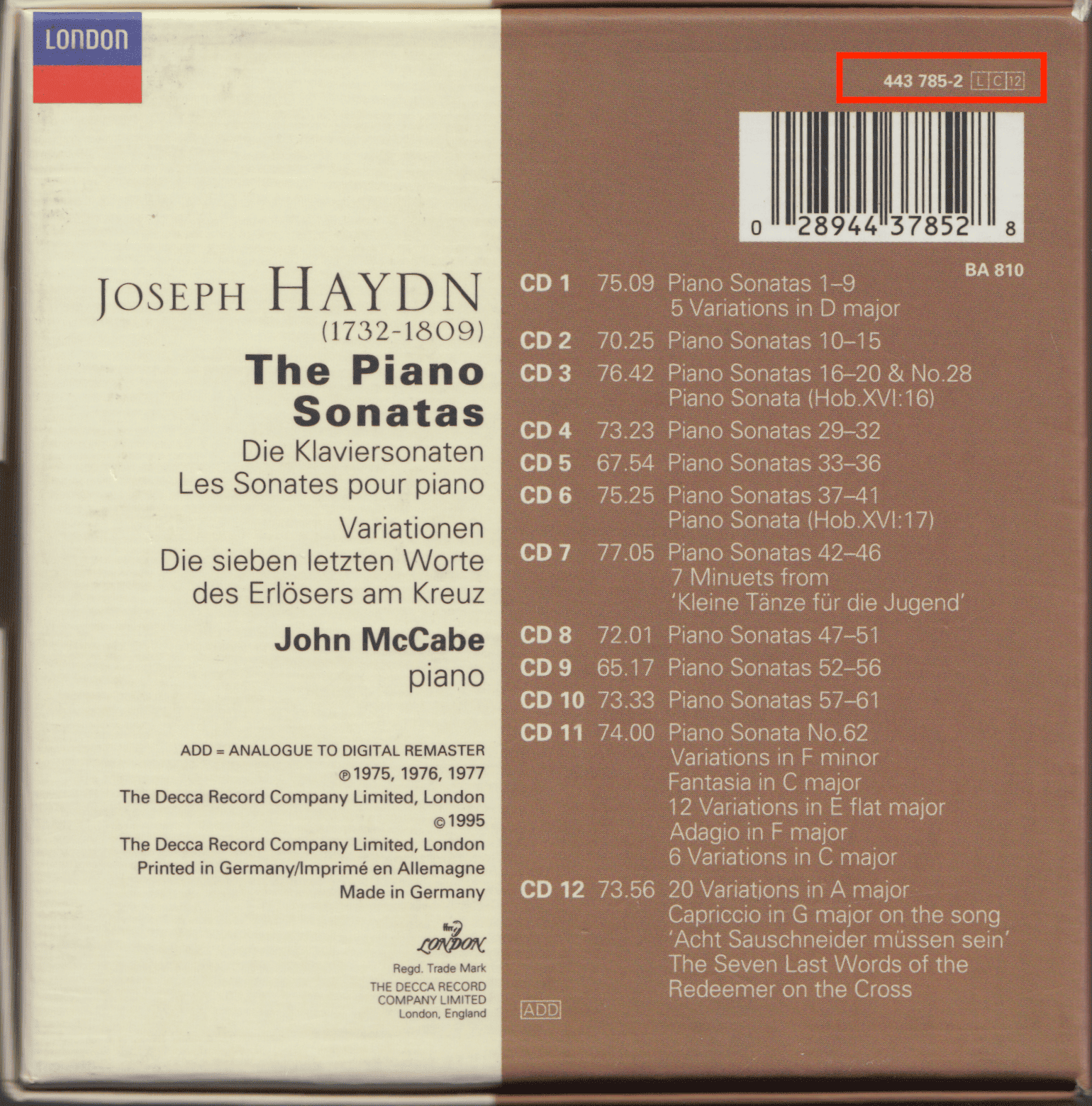 此外,跟迪卡相关的另一个有趣商标品牌-伦敦(London),并没有像迪卡那样使用字母 “X” 来表示合集系列,而是使用字母 “C” 来替代。例如烤肠手中的这套海顿《钢琴奏鸣曲合集》,专辑编号为 443 785-2 L|C12。该专辑共 12 张 CD,由于我依然没有找到更多相关资料,因此推测这里的字母 “C” 很可能是 “Collection” 的意思。