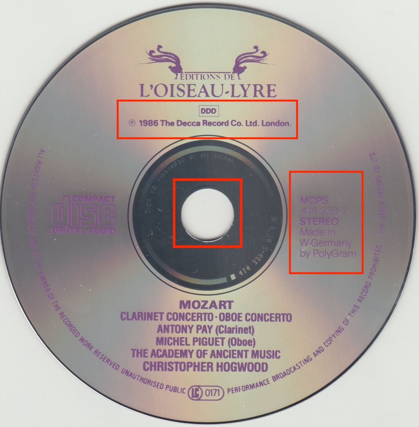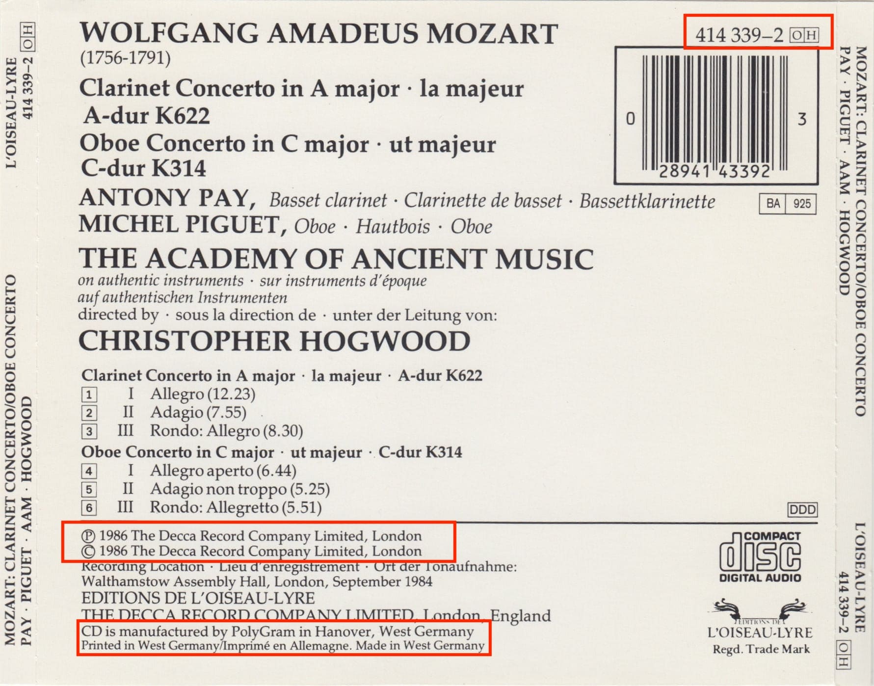至此,烤肠相信屏幕前的你,已经对古典乐专辑上的主要信息有了基本了解,成功迈过了古典乐专辑收藏的入门门槛。最后让我们通过烤肠手中的这张莫扎特《A大调单簧管协奏曲》,专辑编号 414 339-2 O|H 来简单复习一下视频前面介绍的内容。该专辑由克里斯托弗·霍格伍德(Christopher Hogwood)指挥古音乐学院合奏团(The Academy of Ancient Music)演出,其中艺术家安东尼·佩伊(Antony Pay)和米歇尔·皮吉(Michel Piguet)分别演奏单簧管和双簧管。虽然你可能暂时还不清楚字母 O 代表的是天堂鸟(L’Oiseau-Lyre)唱片公司,但至少可以判断出这家唱片公司隶属于迪卡,并且该专辑于 1986 年录音并申请了版权。此外光盘上还标注了立体声 Stereo 、 DDD 标识,以及 MCPS 版权机构,并且该专辑由当时宝丽金所在的西德汉诺威地区生产。最重要的是,它还是一张具有满银圈的高价版 CD。由于该唱片公司发行的专辑数量稀少,它的收藏价值自然不言而喻。至于说什么是 “满银圈” 专辑,受限于视频时长,请允许烤肠在这里先卖个关子。下期视频中,我将继续分享古典音乐专辑收藏的其他内容,揭开那些鲜为人知的专辑秘密。如果不想错过更多精彩内容,还请动动那双灵巧的小手,点赞支持下烤肠的努力,订阅我的频道。小时候喝 x 鹿,长大用 x 度,我是图林根的烤肠,让我们下期再会!