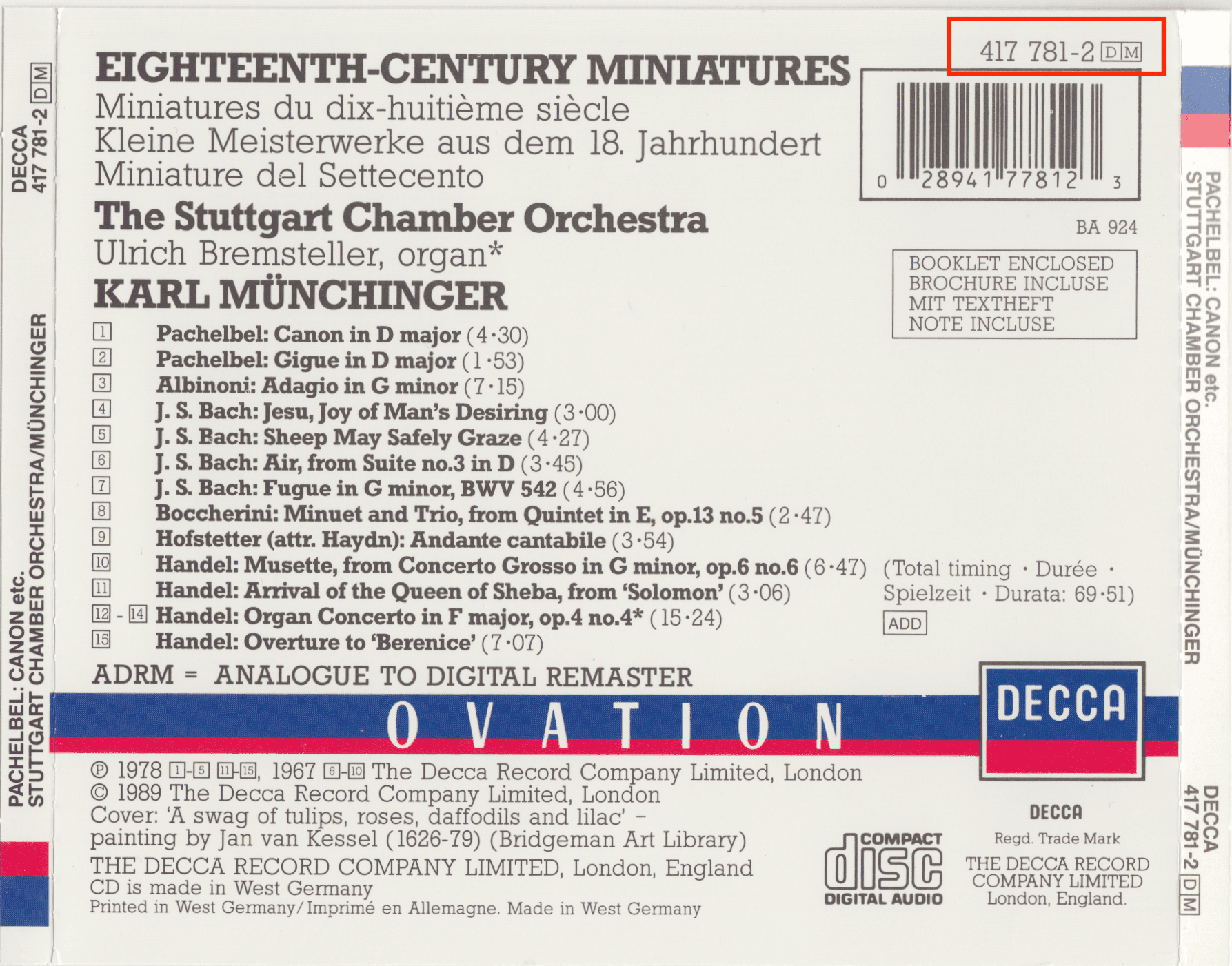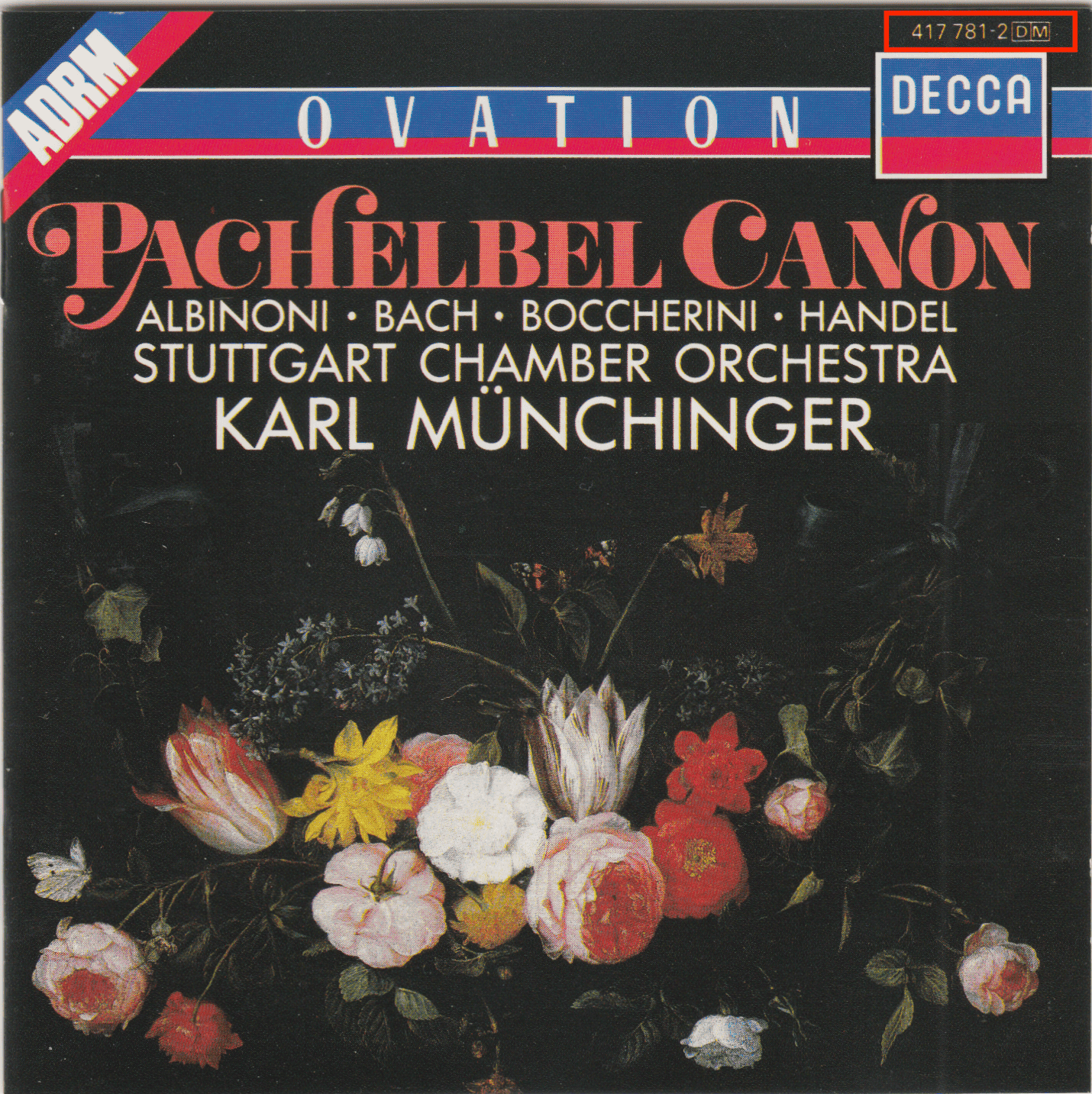 而张迪卡出品的这张帕尔贝尔 - 《卡农》,专辑编号 417 781-2 D|M。虽然这张专辑不仅在重量上比普通版重上不少,而且 CD 的衬底还采用了迪卡专署的特有蓝色工艺。按理说,这应该是属于高价版 CD,但仔细查看专辑编号就不难发现,它其实属迪卡 Ovation 系列的中价版 CD。