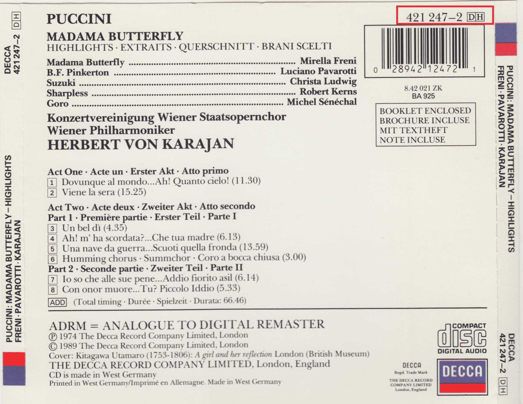 而另一张编号为 421 247-2 D|H 的普契尼《蝴蝶夫人》,虽然外观十分朴实,但是该专辑却属于高价版,这也验证了之前谈到的歌剧系列大多数为高价版的事实。