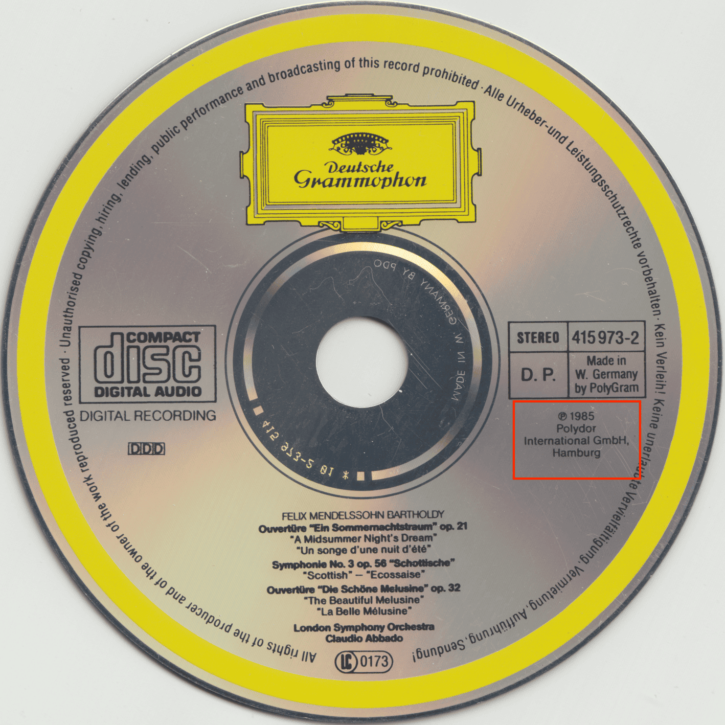 “Made in W. Germany by PolyGram”。相信各位看官一眼就能识别出,这实际上是光盘的生产地址,它表明这张专辑是德国生产的版本,并且由宝丽金(PolyGram)自己的工厂生产。通过网上的资料便可以推算出, 该专辑的生产时间大约在 1982 到 1985 年之间。而随着时间推移,光盘上的生产地址标注也经历过多次变化。按照时间顺序来看,