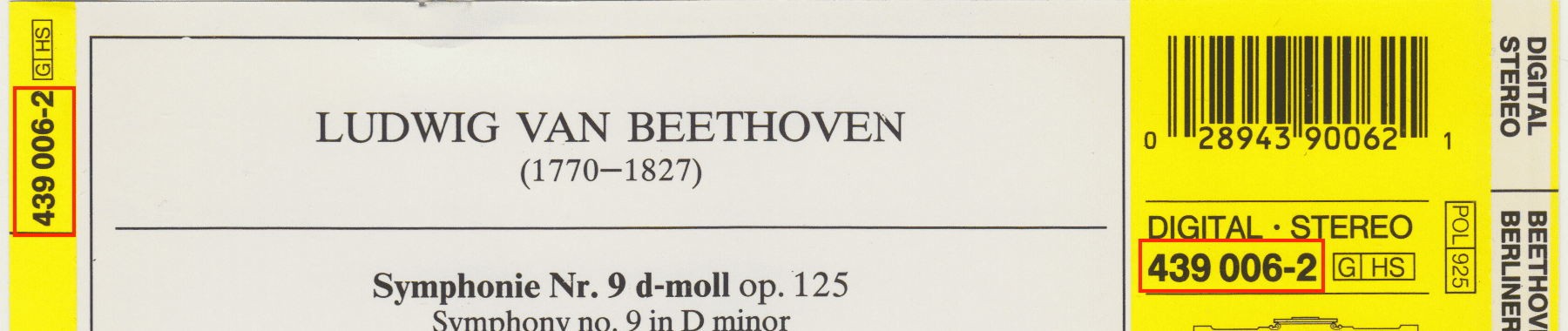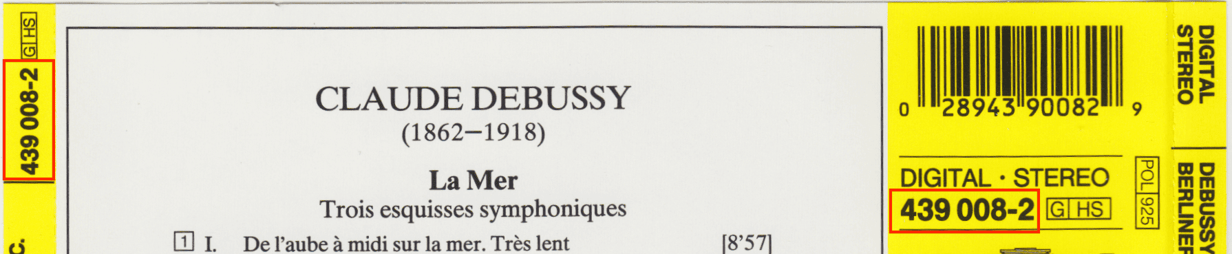 例如,这张由卡拉扬指挥、柏林爱乐演奏的德彪西《大海》,专辑编号 439 008-2。仔细观察后便会发现,439 和 008 之间有空格分隔。开头的 439 其实表示的是“卡拉扬金版系列”,而后面的 008 则表示为这张专辑为该系列中的第 8 张光盘。因此,只要看到以 439 开头的专辑,我们就可以百分百确定它属于卡拉扬金版系列。为了验证这一点,不妨让我们再来看一张贝多芬的《第九交响曲》,编号为 439 006-2。显然这张专辑的编号前三位为 439, 也都归属于卡拉扬金版系列。