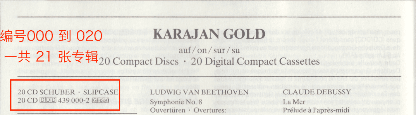 一般只要是唱片公司的经典系列,或多或少都会在随盘信息页中透露出一些信息。从这张专辑中的随盘小册子中就可以看到,卡拉扬金版系列一共出品了 21 张相关的专辑。不过有一点需要注意的是,小册子中的宣传目录是在当时那个年代已经出品的内容,不代表在未来会推出后续新品。因为烤肠手里还有一张同系列的海顿《惊愕》和《时钟交响曲》,作品编号为 439 038-2 ,很明显这张专辑的中间三位的序列为 38,已经超过了前面介绍的包含 21 张旧版本专辑的目录。