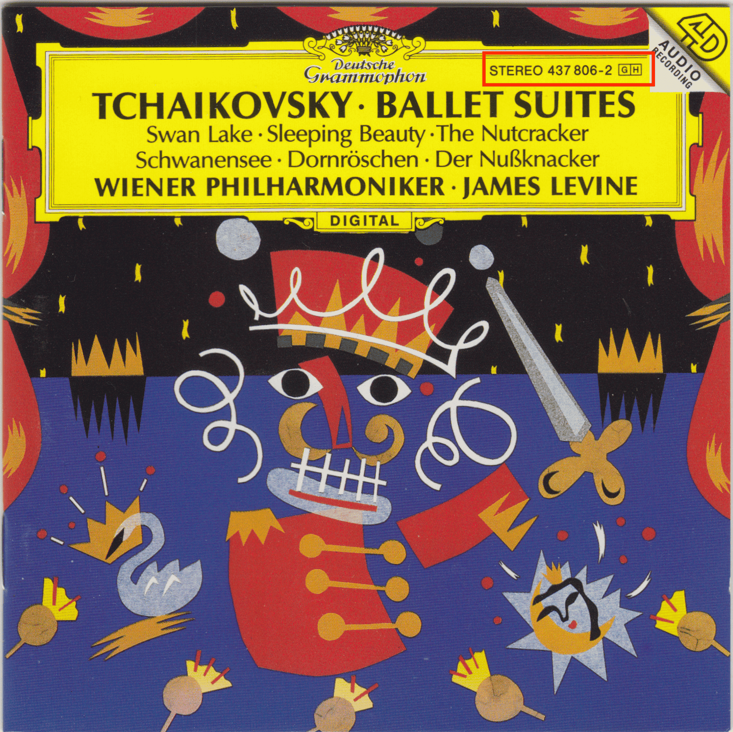 而排在公司名称后的英文字母通常用于表示版本零售价格的高低。例子中的字母 H 代表高价版(High Price),而 M 则为中价版(Medium Price)。相较于比于今天的购买力,高价版大概相当于现在 20 欧元以上,而中价版则维持在 15 欧上下。通常来说,DG、飞利浦和迪卡的高价版专辑大多以单张 CD 的形式发行,封面配以特定人物肖像或单一书画作品,辨识度极高。此外,歌剧专辑或 DG 早期使用 4D 技术录音的唱片也多属于高价版,例如图片中的这张老柴的《芭蕾组曲》,编号 437 806-2 G|H 也属于高价版。这些版本不仅音质卓越,外观设计也极具收藏价值。而对于飞利浦出品的专辑,其实还有一种更为简单的辨别方法,那就是直接观察封面上的装饰封条颜色。金色封条表示高价版,而银色封条则为中价版。这种直观的设计对消费者尤为友好,可以瞬间辨识所售专辑价格的高低。