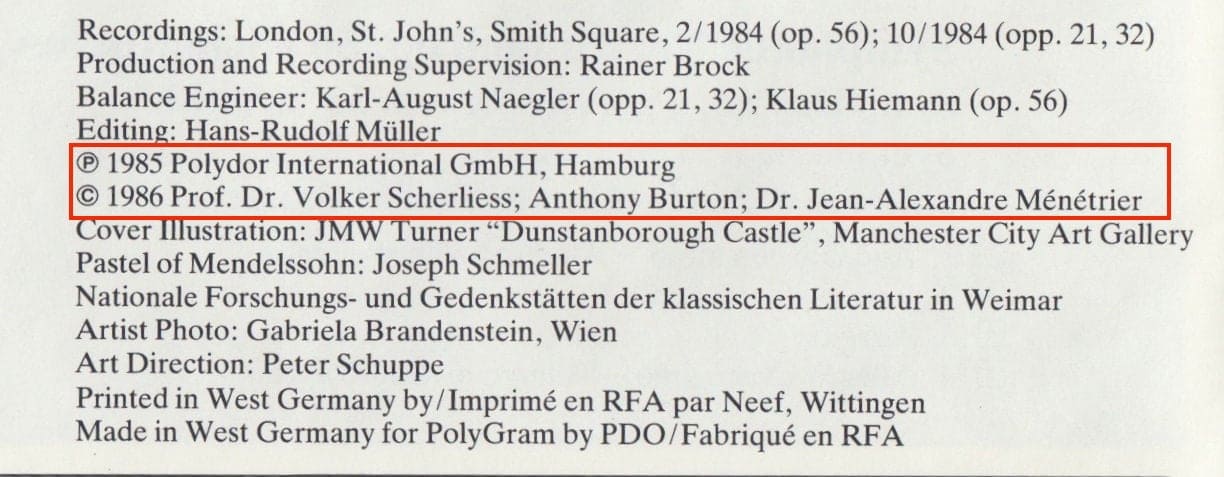 在看完生产产地的内容后,让我们简单关注一下生产产地下方的一段文字 (Ⓟ 1985 Polydor International GmbH, Hamburg)。其中,带有圆圈的英文字母 Ⓟ 表示录音版权(Phonogram Copyright),意味着该专辑的录音在 1985 年注册了录音版权,并且归属于宝丽金唱片公司。而另一个常见的带圈字母 ⓒ 则表示作品版权 (Copyright),指的是音乐作品本身的著作权归属。