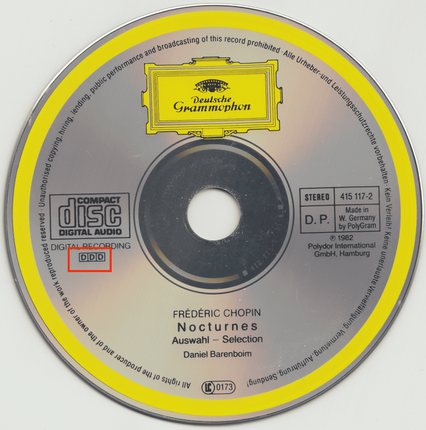总算是聊完了专辑编号,可是当我们仔细查看包装甚至是打开盘盒的时候,还会发现上面印有更多的信息:例如左边这张是普罗科菲耶夫的《彼得与狼》,而右边这张是肖邦的《夜曲》,通过简单对比就可以清晰的发现,光盘表面分别面印有 ADD 和 DDD 的标记。此类标记表示的是专辑制作的技术方式,它们是由专业录音室协会(Society of Professional Audio Recording Services)定制并且推荐使用,因此该代码也被称作 SPARS 代码。此类代码使用英文字母 A 和 D ,并且采用三位字母的形式组成。它们表示了在唱片制作的三个重要过程:录音、混音和音频母带的制作使用的是模拟技术还是数字音频技术。其中 A(Analog)代表模拟技术,而 D(Digital)代表了数字技术。按照这个顺序,我们可以很清晰地了解到,ADD 表示的是专辑录音过程使用了模拟技术,而混音和母带的制作则使用了数字技术。同理的 DDD 则表示这三个环节全部采用了数字技术。
