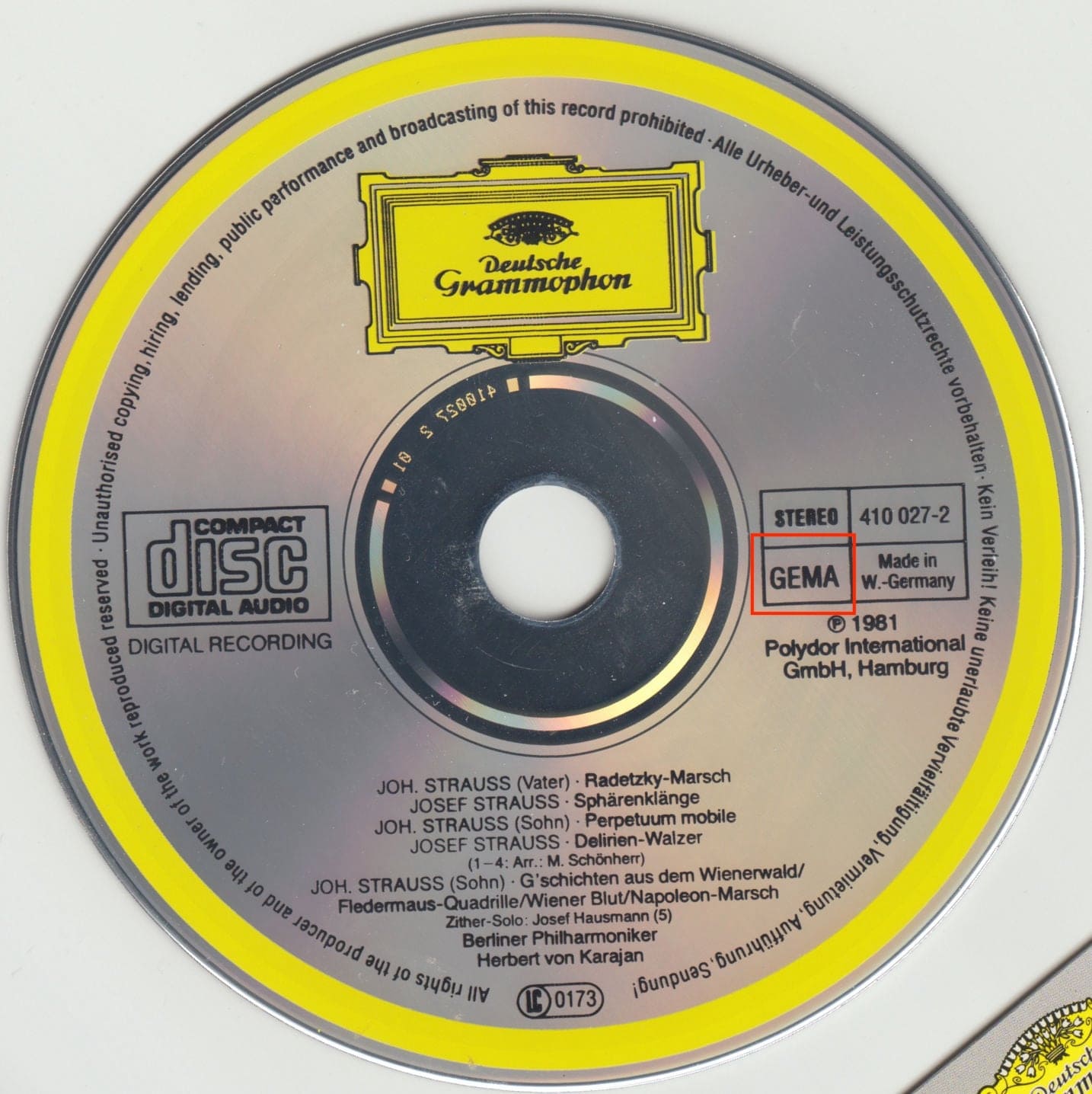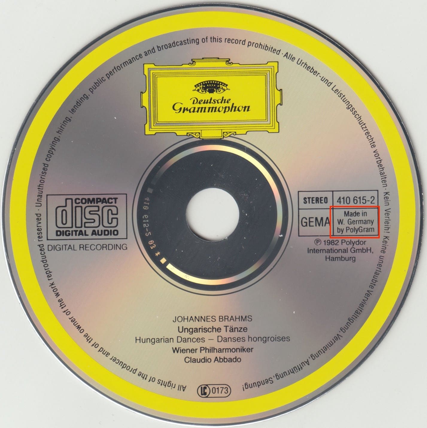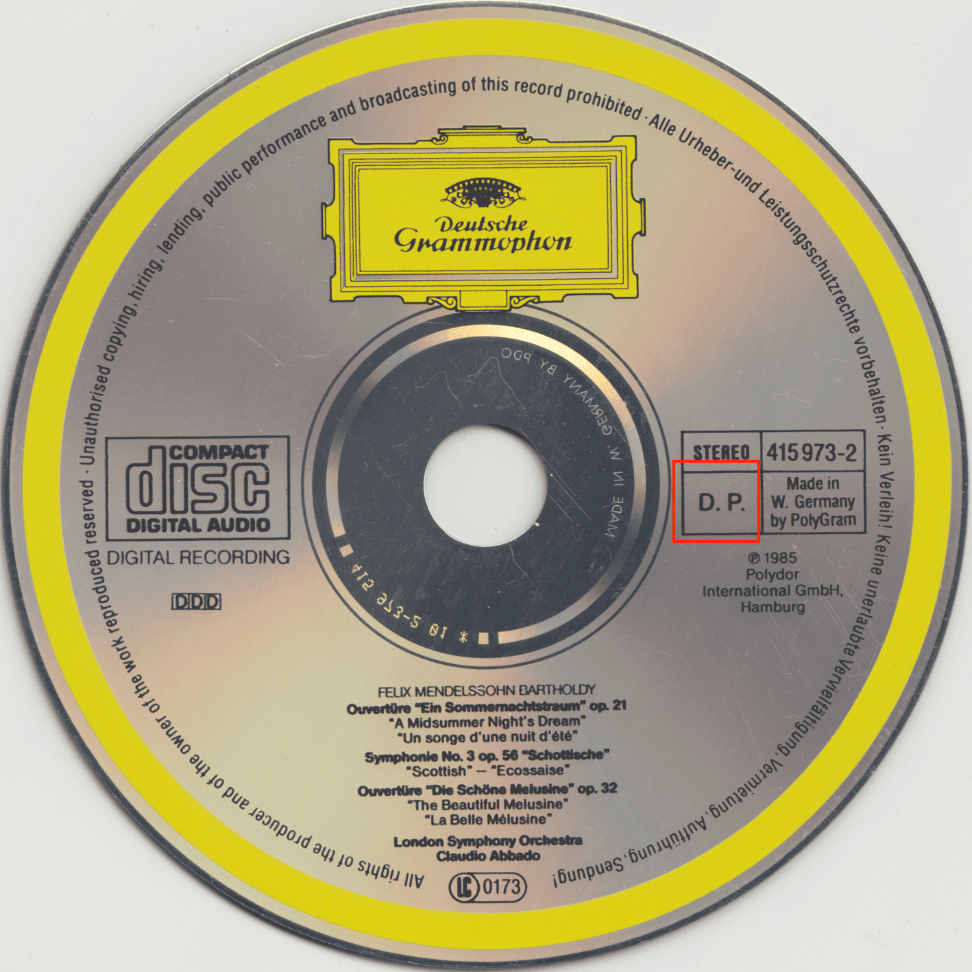 1986 - 1993 年期间,光盘上通常会标有 Made in W. Germany by PDO,其中的 PDO 是“飞利浦杜邦光盘责任有限公司(Philips and Du Pont Optical GmbH)”的缩写,这家工厂位于当时西德的汉诺威。
