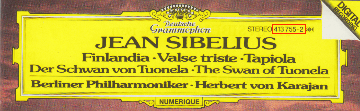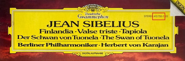 接下来,让我们一起走近古典音乐的珍贵录音,先来看一张专辑的外表面。首先映入眼帘的就是非常显眼的经典 DG 黄色 Logo。接下来是作曲家西贝柳斯的名字及作品名称《芬兰颂》等。此外专辑上还标注了指挥卡拉扬和柏林爱乐的德语名称。其实在音乐专辑的包装上,除了作曲家、作品名称、演奏者、指挥、乐团等这些基本信息外,还有一项至关重要的信息,那就是专辑编号。每家唱片公司都会为旗下的专辑分配一串独一无二的编号,它不仅有助于精准查找专辑,也能帮助收藏者快速识别专辑的关键信息。以 DG、飞利浦和迪卡为例,它们的唱片编号通常采用 3+3+1 的结构。例如这张专辑的编号为 413 755-2,其中 413 755 是专辑的正式编号。而对于收藏黑胶唱片的朋友来说,可能会注意到,DG 在早期也发行过同名专辑,但是编号为 413 755-1 的黑胶版本。这张黑胶唱片和 CD 专辑不仅封面几乎完全相同,甚至在听感上也近乎相似。这是因为唱片编号后缀的数字只是用来区分音乐媒介的不同,这其中: