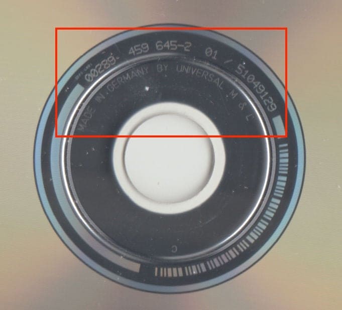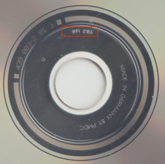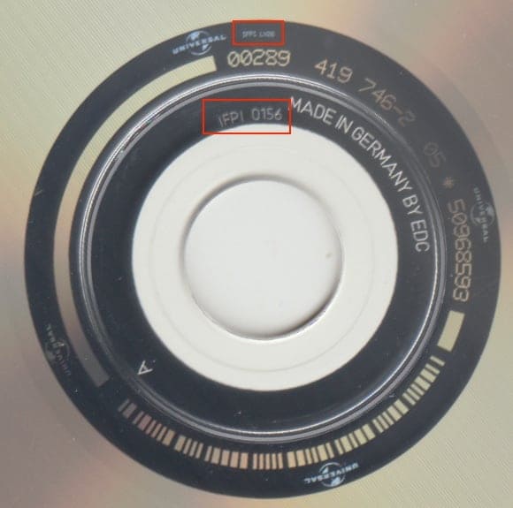 到此为止,光盘上面的基本信息已经介绍完毕,可如果仔细观察的话,尤其是在光线充足的环境下,其实还能发现光盘的内圈上面还有一些不那么容易发现的隐藏信息 - 矩阵码(Matrix Code)。所谓的矩阵码是制造商在光盘生产过程中使用激光蚀刻在CD反射层内圈区域的一串数字和字母编码,这串编码也常常被称为“光盘内圈码”或“内圈标记”等。通过光线照射,稍微偏转下角度我们就可以清晰的看到矩阵码上面的内容。虽然不同厂商的矩阵码格式会有所差异,但它通常包括了唱片编号、母盘序列号、制造厂商代码等内容。而矩阵码中里面最重要的内容之一就是光盘的“身份标识”,即 SID(The Source Identification)编码。这个编码是由国际唱片业协会 IFPI (International Federation of the Phonographic Industry) 统一制定的,该协会会为每一位成员的 CD 制造设分配一个独一无二的编号,并且这个编码将会在 CD 的制造过程中使用。通常来说,正版光盘都会具有两个不同的 SID 编码。光盘的第一个 SID 通常为大写的英文字母 IFPI + 大写英文字母 L 加额外的数字组成,这个代码通常在光盘内圈的最外侧,它表示的是音乐母盘的编号代码(Mastering Code)。而第二个相对容易找到的 SID 编码通常位于光盘内圈的最里侧,由大写的英文字母 IFPI + 字母和数字组成,它通常有光盘制造商自己分配,表示的是光盘生产设备的代码(Mould Code)。