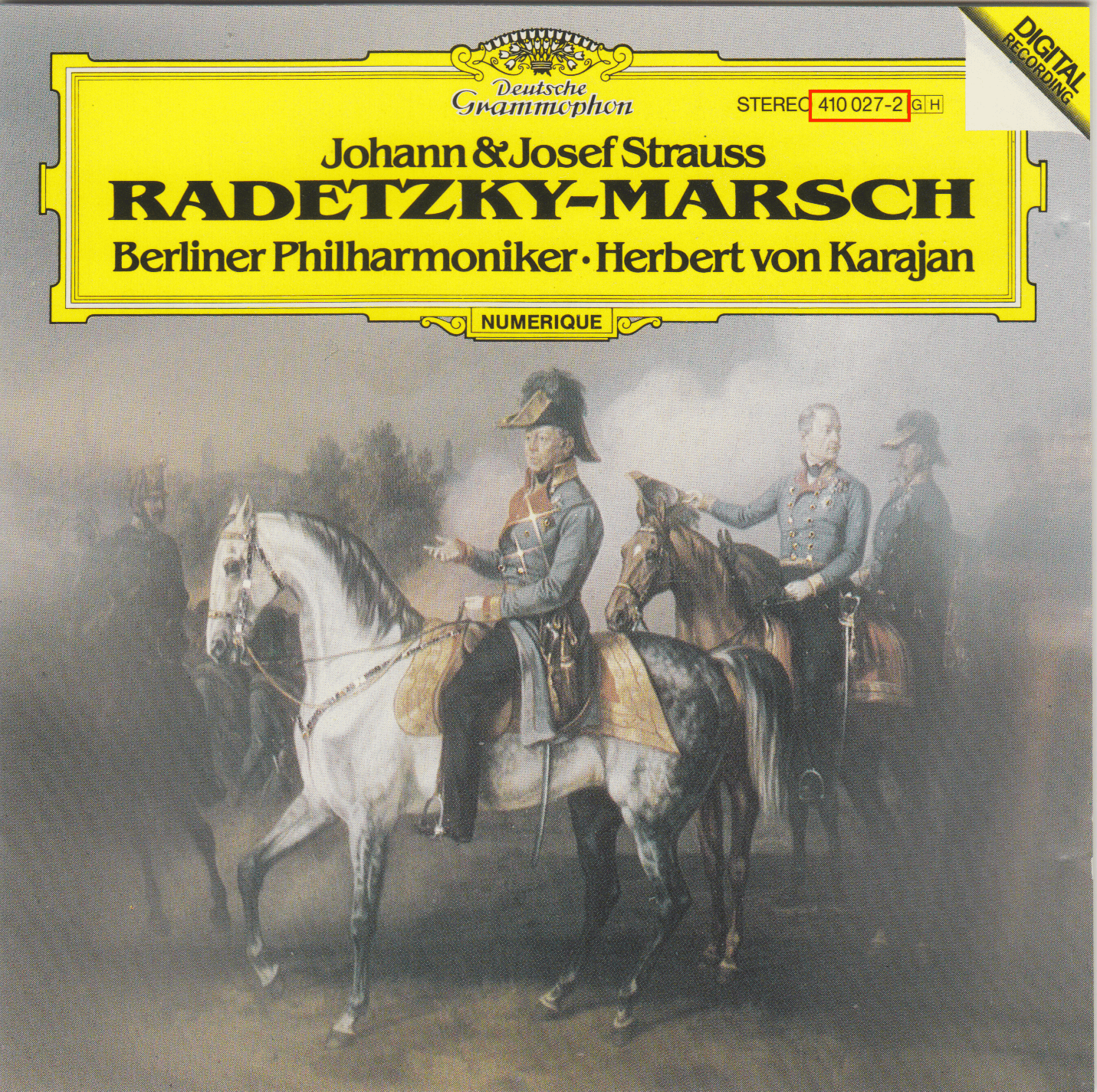 至于说专辑开头的前三位数字,例如这张《拉德斯基进行曲》的专辑编号(410 027-2)就以数字 410 开头,那么这个 410 是否也有其它特殊含义呢?很遗憾,烤肠我目前也没能获得更详细的命名规则。这些编号的设计通常是按照唱片公司内部的分类标准来归类,严格意义上来说,并没有对外公布。对于像我这样的普通收藏者来说,仅靠自己的努力是很难完全解读其背后的逻辑。而且随着时代变迁,DG 的官网也已不再提供旧版专辑信息的查询支持,想要了解更多信息只能从早期出版的唱片目录或者一些网上公开的资料库中获取线索。