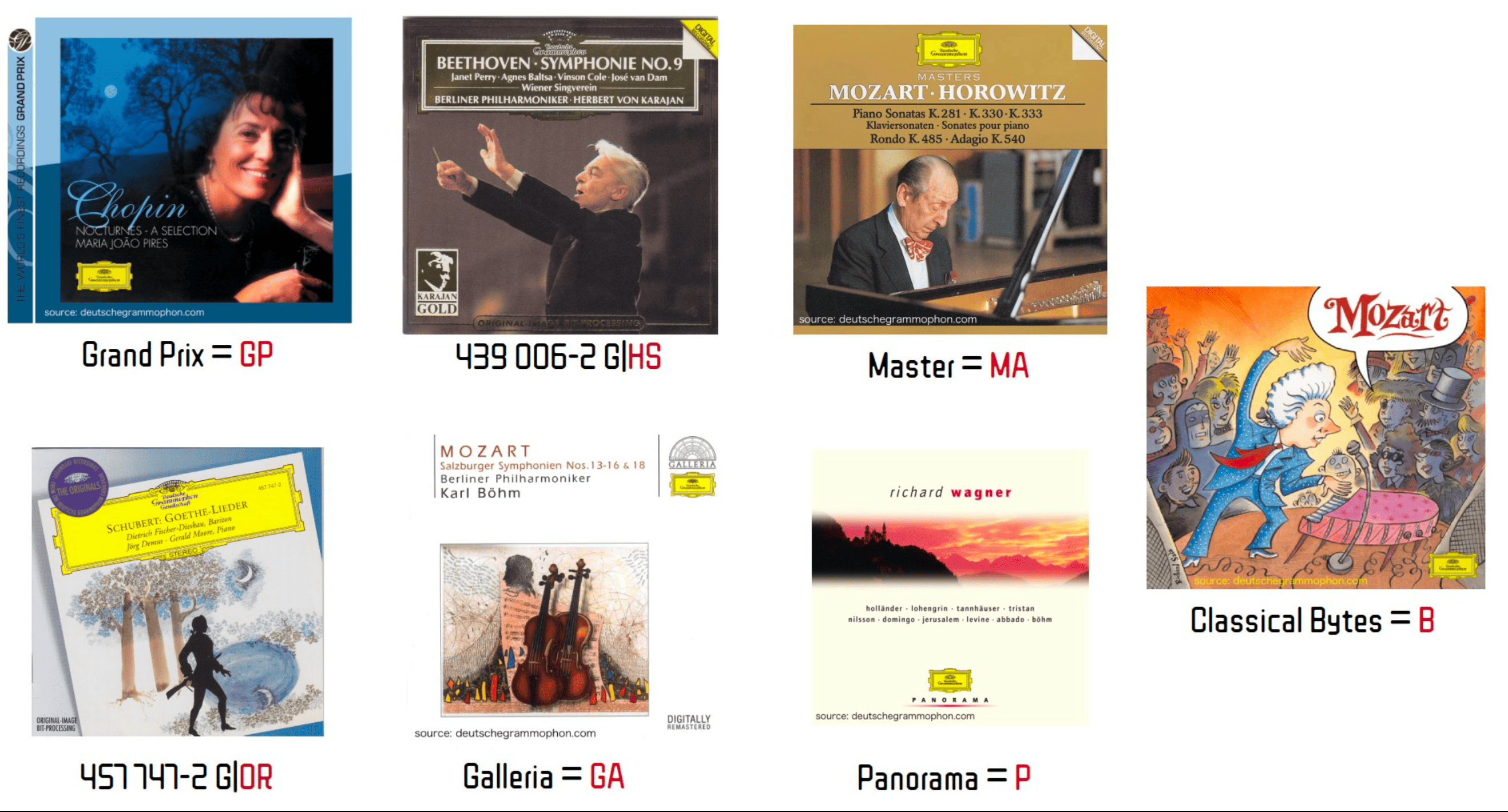 实际上,除了字母 X 外,DG 还推出了许多其它系列版本,其中大多数为中价版专辑。少量为高价版。例如 DG 公司后期出品的 Grand Prix 系列的专辑,该系列的专辑编号就以字母 GP 为代表作为高价版出售。这个系列里面每一张专辑都非常值得推荐,并且被认为是 DG 公司百年历史中最经典的录音。而视频前面提到的高价版 “卡拉扬金版系列” 其实使用了字母 “HS” 来表示,另外介绍的 “The Originals” 和 “艺术长廊系列” 系列这类中价版专辑则分别以字母 “OR” 和 “GA” 作为标识。除此之外,DG 还有出品了许多其他的古典音乐系列专辑:例如适合大众入门收藏的 “经典大师(Master)系列”,使用了字母 “MA”;以及广泛覆盖古典乐各种小品的 “全景系列(Panorama)”,其编号末尾使用了字母 “P”;而针对儿童入门的 “古典字节(Classical Bytes)系列”,则以字母“B”作为标识。