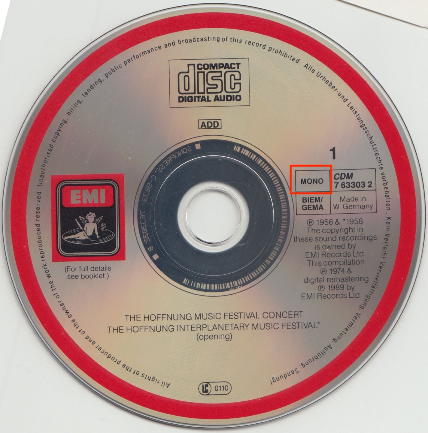 说完了 ADD 和 DDD 的区别,我们再来看一下这张门德尔松《第三交响曲》右侧的标注信息。首先映入眼帘的是 Stereo 标签,它代表了该 CD 具有双声道录音,可以播放出立体声环绕的效果。由于 CD 属于数字音频载体,绝大多数唱片都是以立体声格式发行,只有极少数专辑仍保留最早期的单声道录音,光盘上才会标注单声道 Mono 的信息。截至到目前,黑胶唱片上常见的单声道标识,在 CD 上烤肠我还未曾见过。而在 EMI 的唱片中,倒是遇到过少数几个例外。例如这张专辑 《霍夫农音乐节》(Hoffnung Music Festival, CDM 7 63303 2),便是将 20 世纪 50 年代的单声道录音转制为 CD 再版发行。