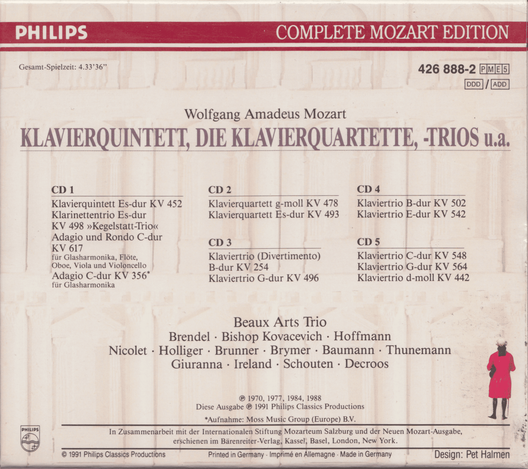 在聊完了 DG 的唱片,我们再转过来简单看下飞利浦和迪卡。同样的是,飞利浦和迪卡的唱片也遵循着与 DG 相似的命名规则,只不过它们也存在使用特殊字母来表示特定专辑的情况。例如飞利浦在早期推出的莫扎特诞辰 200 周年全集系列就使用了字母“E”来表示,这套莫扎特《钢琴三重奏与四重奏》专辑,编号为 426 888-2 P|M|E5,烤肠推测这里的字母应该是 Mozart Edition 的缩写。