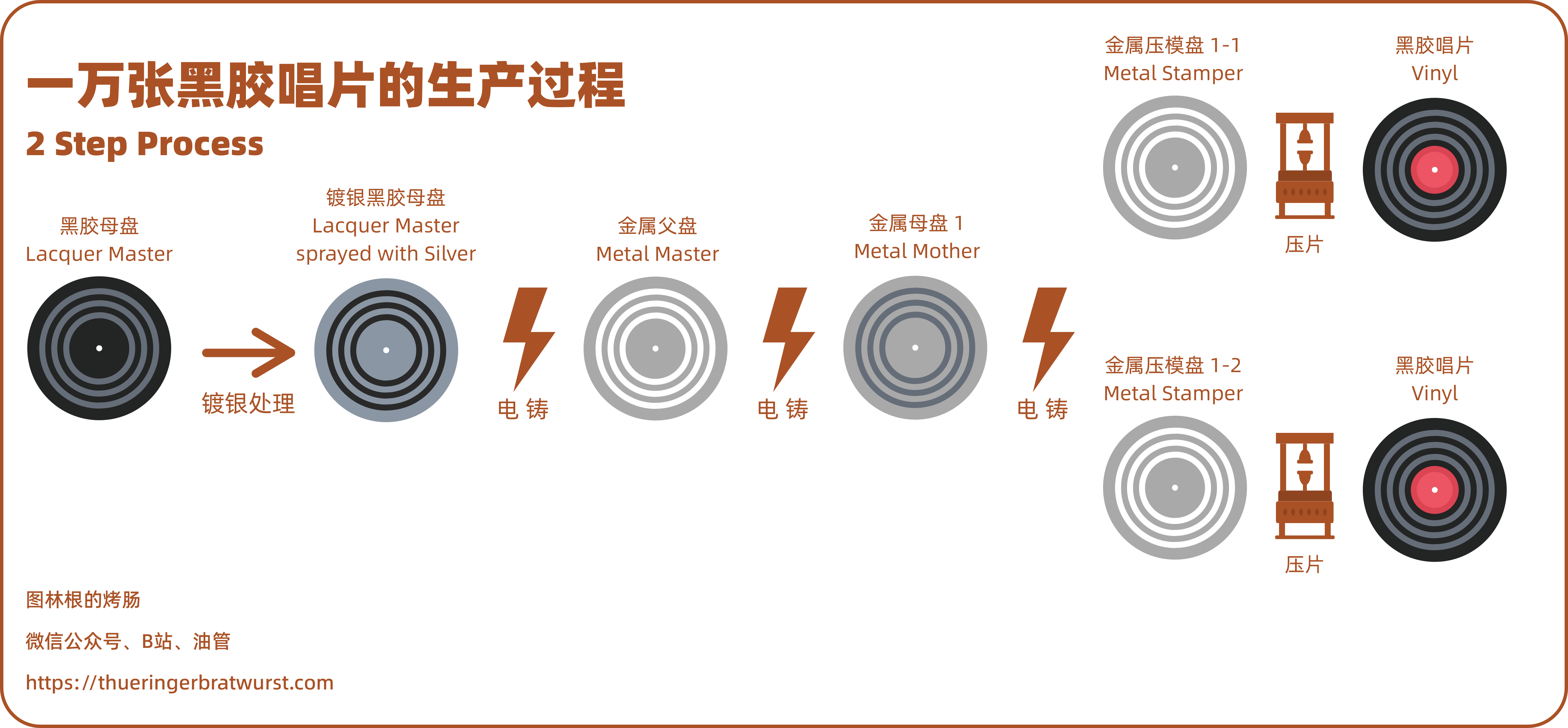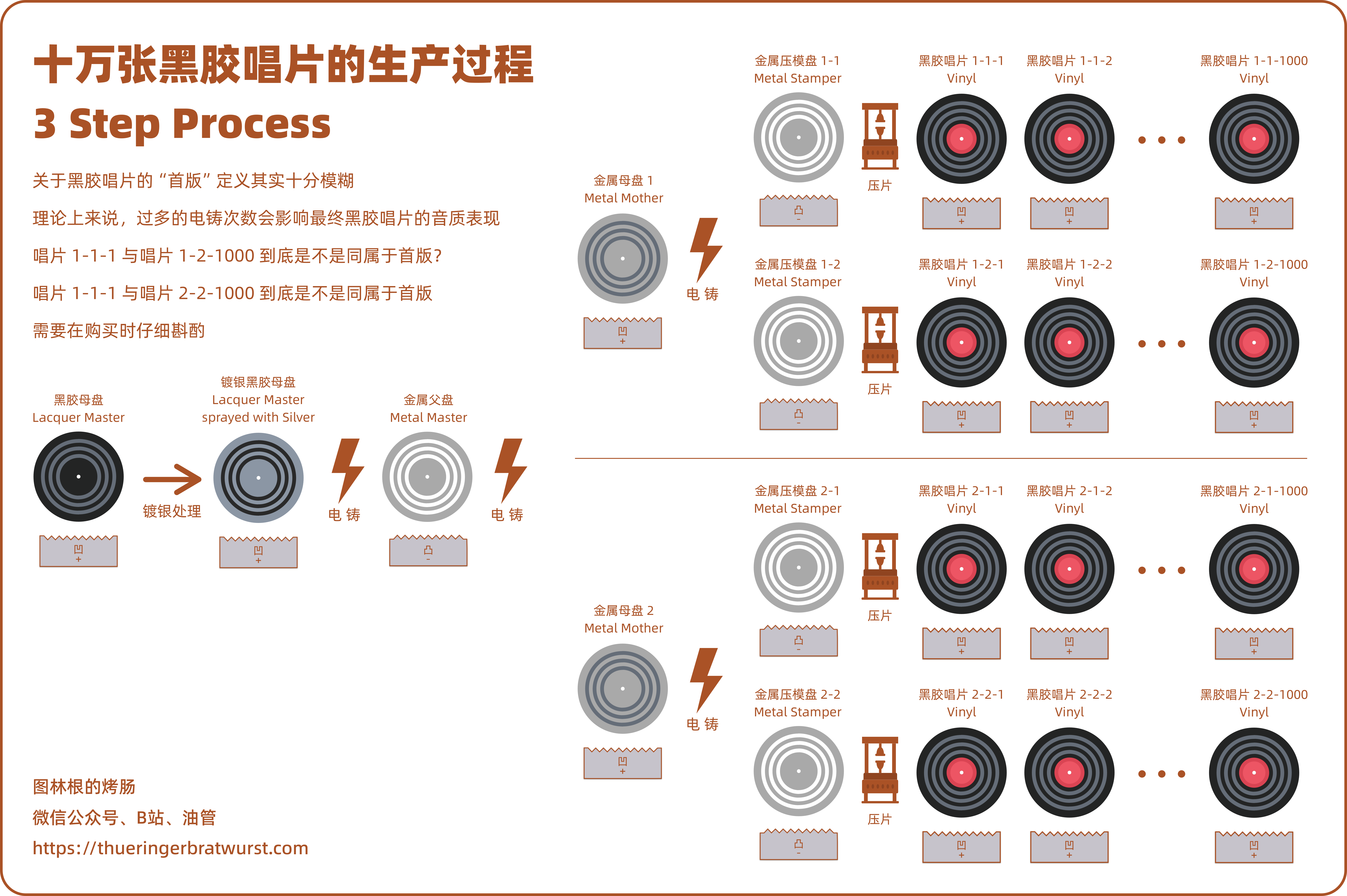 既然刚才提到了黑胶唱片的“首版”,那么烤肠在这里还想补充一个非常容易忽略的细节。那就是 黑胶唱片中 “首版” 这一概念其实并没有一个完整统一的标准。对于产量较小的唱片(例如发行量不足一千张)来说,通常会直接使用第一代金属父盘完成全部压制,不会出现多个金属模具版本,自然也就无从区分所谓的首版与再版。然而对于大销量(通常一万张左右)的唱片而言,情况则略微复杂。通常来说,只要是使用了第一版金属母盘,不论其衍生的父盘是第几代,制作出来的唱片在原则上都可被归入首版的范畴。换言之,它涵盖了图片中由金属压模盘1-1和压模盘1-2后续生产的所有唱片。值得注意的是,在实际量产中,为了满足极大规模数量(十万张以上)的生产需求,金属父盘盘同样会被多次电铸,进而衍生出第二版、第三版乃至更多版本的金属母盘,也就是图片中由金属母盘1和金属母盘2衍生出的唱片。这也意味着,即便最终的唱片都出现在初版发行窗口内,但它们的音质表现,则会因为金属模具版本的不同而存在细微但真实的听感差异。因此,在更加严谨的语境中,“首版”通常特指由第一代金属母盘首次衍生制作的的唱片。这正是图中所示从母盘 1 到黑胶唱片 1-1-1000 的这条链条所涵盖的产品范围。