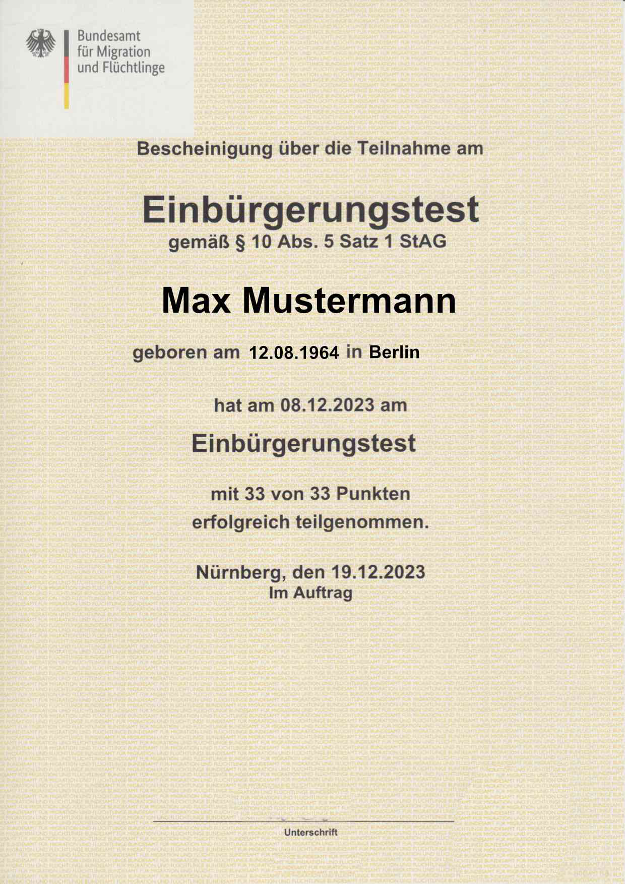 如果你打算在手机上轻松练习试题的话,欢迎下载我个人开发的App(可惜暂无安卓版)来进行体验。已经更新到了最新版的题库,添加了关于以色列相关的内容。不但支持中文翻译试题内容,还可以添加个人笔记随时查看,更可以进行模拟测试随时掌握自己的情况。免费版可以无障碍体验部分试题,解锁全部内容仅需1.99欧,绝对物超所值,苹果商店搜索 “Einbürgerung in Deutschland” ,或者文点击 这个链接 。最后附上我的个人满分成绩单,祝各位考试顺利!