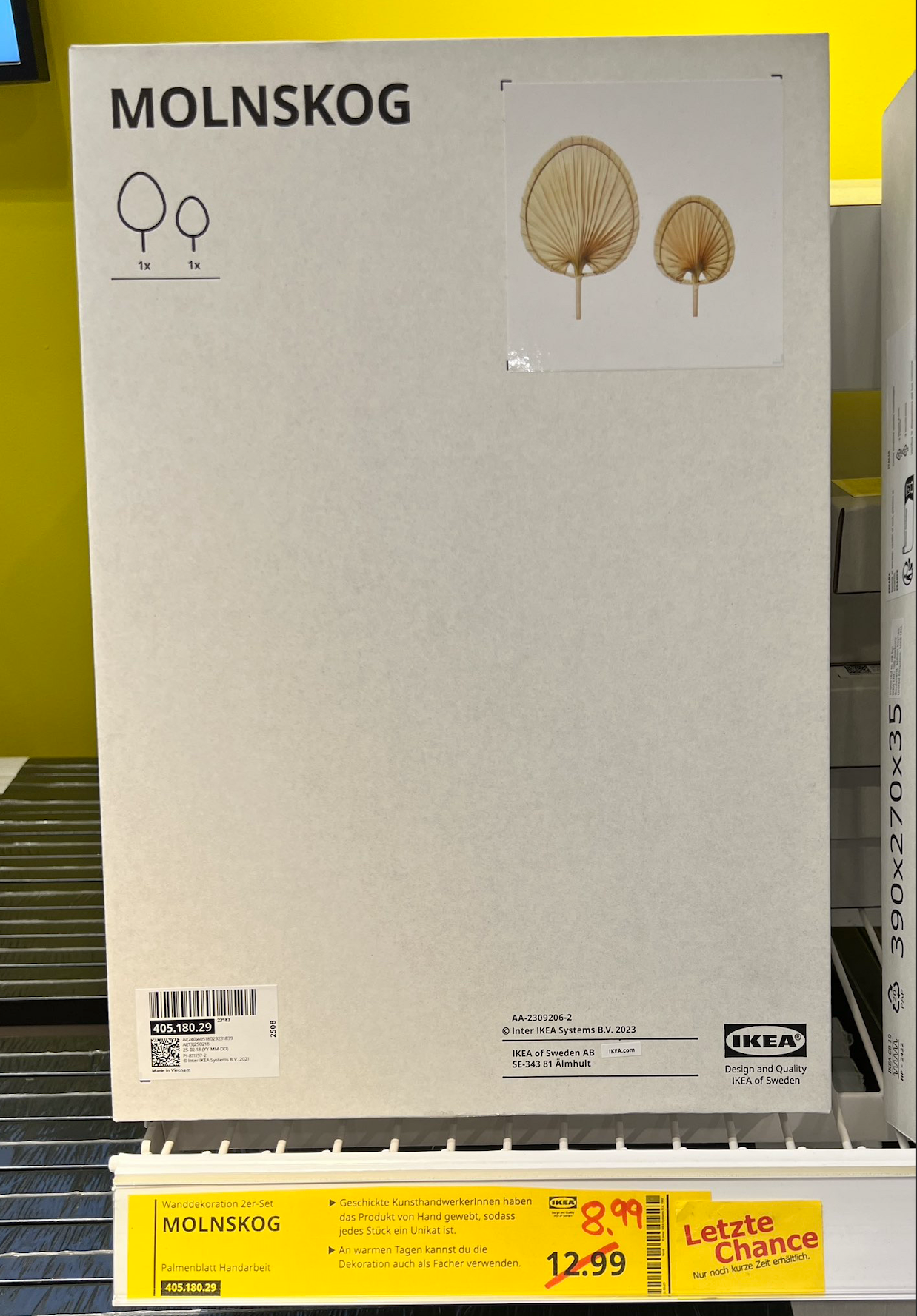 IKEA 宜家不便宜的扇子 图林根的烤肠 收录于 Twitter 2025-06-09 约 100 字 预计阅读 1 分钟 目录 好家伙,这是得有多么自信,宜家这两把小扇子才敢卖 9 欧元,大概 70 多块人民币。虽然只是个装饰品,还没有解暑扇风的作用,这还是打折后的最后机会 “letzte Chance”,原价得将近人民币 100 块了🤣 宜家的扇子 Please enable JavaScript to view the comments powered by Disqus.