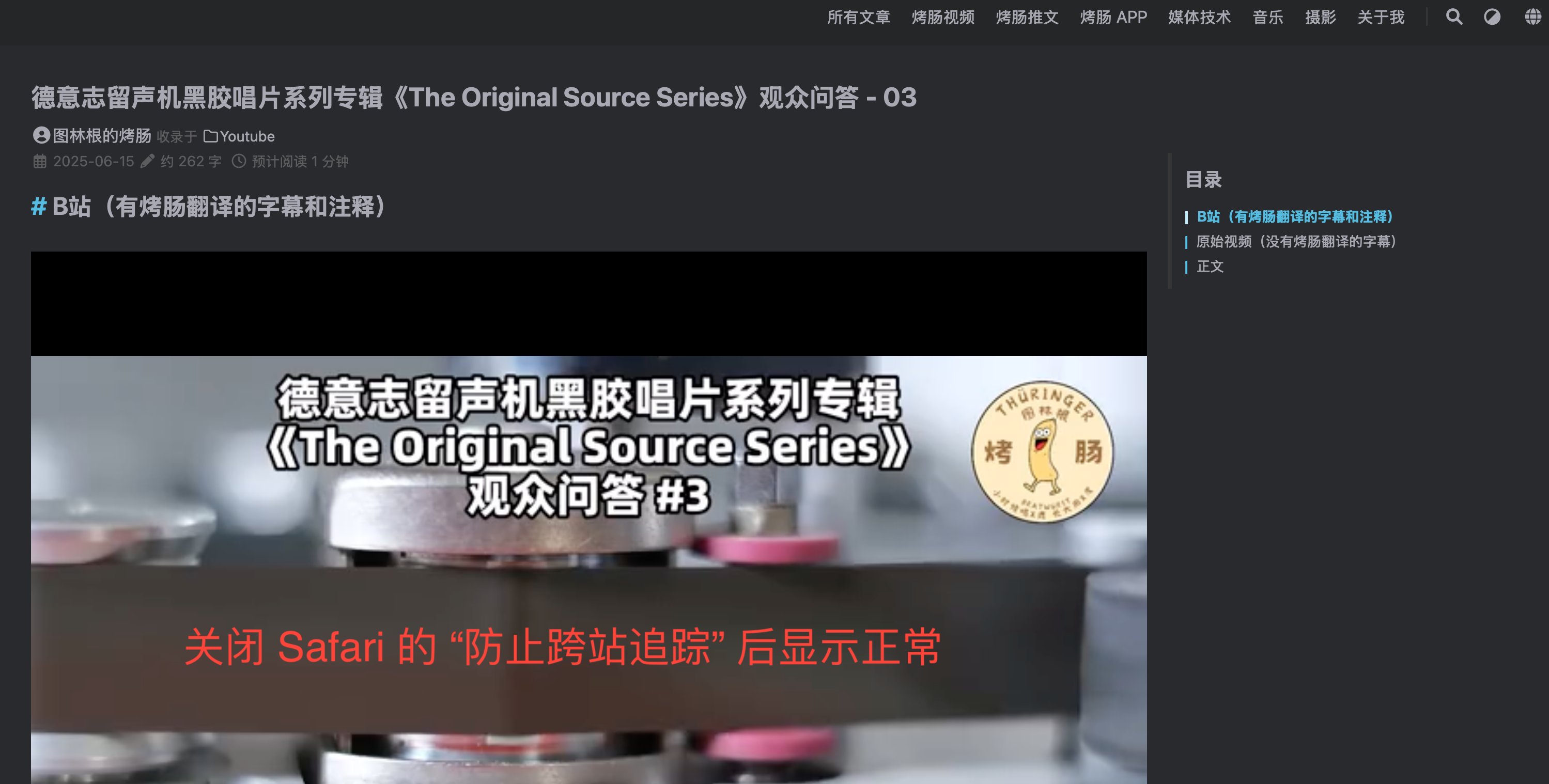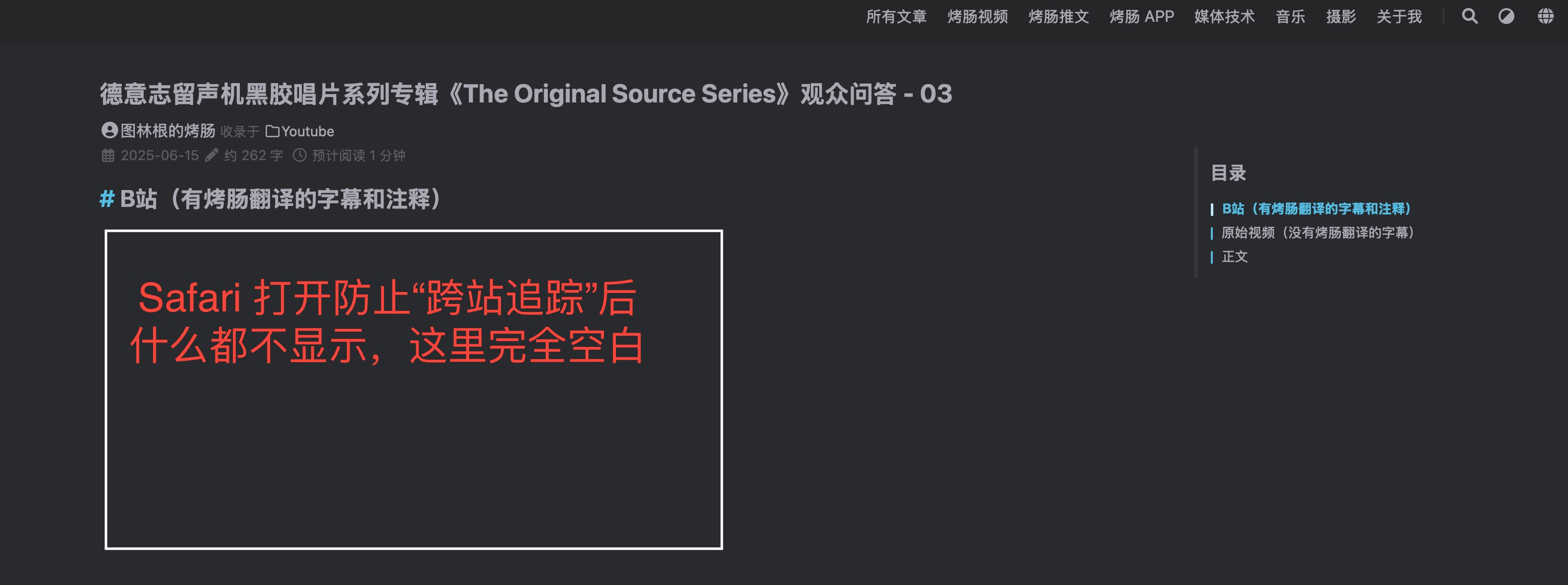 刚才尝试了半天去修复个人主页无法显示 B 站视频,但是油管却显示正常的原因。前后折腾了好几个小时,总以为是网站的设置问题,瞎折腾了半天结果还是一无所获,结果后来在我偶然更换了 Chrome 之后才发现原来网站一切正常,于是我这才反应过来是 Safari 的问题。仔细查看隐私选项后发现原来是 Safari 打开了 “防止跨站跟踪”,关掉后 B 站就可以正常显示了。