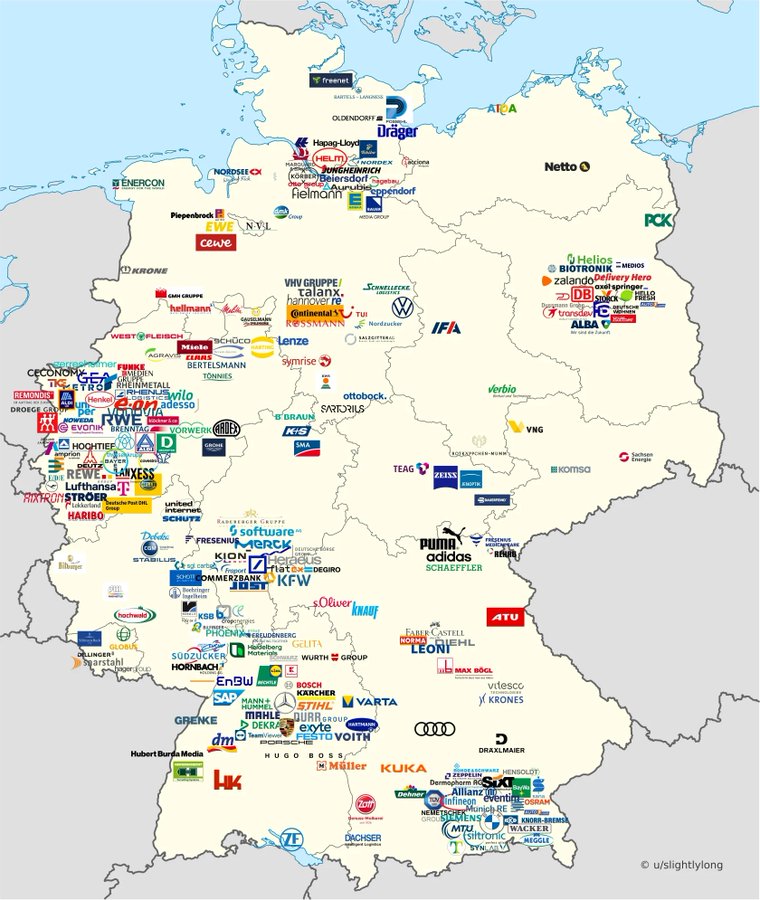 从这张经典的图片就能看出来,除了东北的柏林外,东西德差距还是依然十分明显,著名企业大多都位于原属于西德的地方。