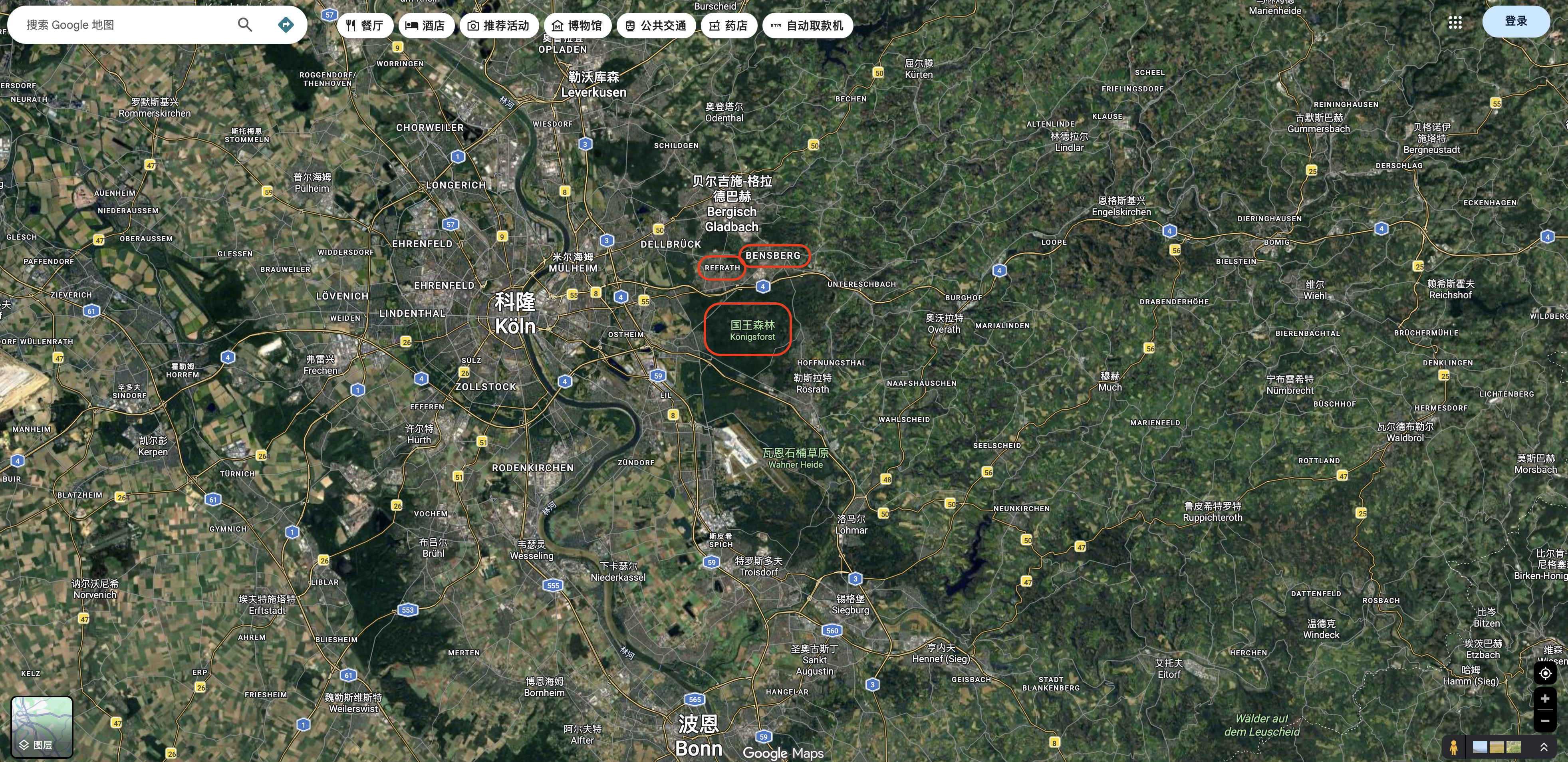 还是拿科隆来举例,看下地图就不难发现,科隆东边紧挨着国王森林(Königsforst)的 雷夫拉特 (Refrath) 和 本斯贝格(Bensberg,P1)是最佳之地。从这里开车到科隆大教堂大约15分钟,但是这里却远离市区的喧嚣,还有着更为舒适的环境。