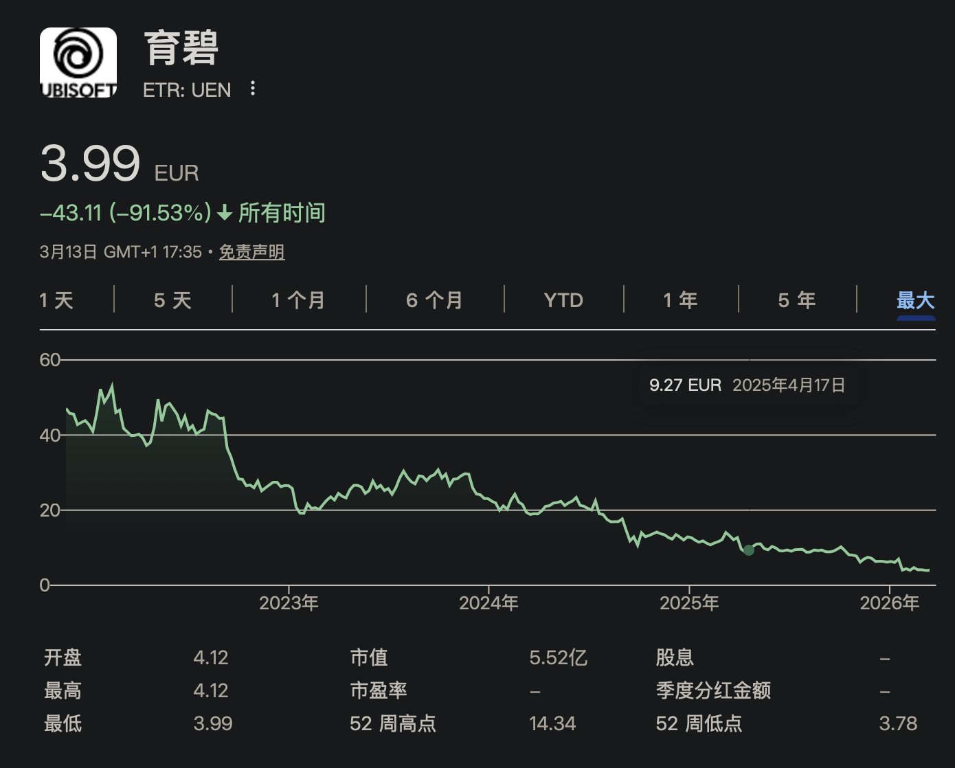 再加上在其他游戏的各种作死行为,育碧的股价已经从高点的48欧跌到了目前的4欧,不出意外的话,估计它离被收购也不远了😂
