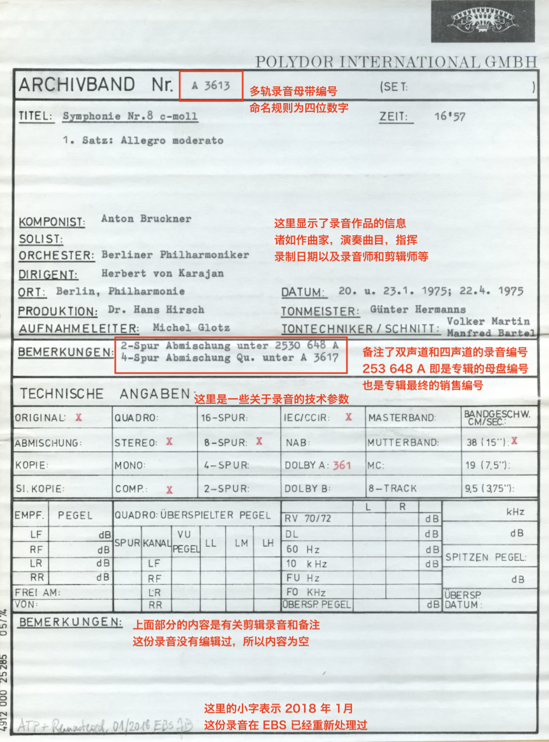 在“烤肠聊古典”的 《古典乐 CD 入门收藏指南(上)》中,我们深入探讨了 CD 生产的关键环节,例如 AAD、ADD、DDD 这些标识如何反映录音、混音和母带制作的技术路径。但还有一个核心问题未曾涉及:这些唱片的母盘到底是如何制作的? 这一幕后工艺决定了音乐最终呈现的音质,而它的制作方式,也直接影响了唱片的收藏价值与版本区别。就在不久前,德意志留声机公司(DG)发布了全新的 The Original Source 黑胶系列,该系列全程采用模拟技术重新刻制黑胶母盘,并进行了再版制作。为了让音乐爱好者深入了解这一工艺,DG 还特别制作了一部纪录片,详尽介绍了卡拉扬指挥的布鲁克纳交响曲黑胶母盘的制作全过程。尽管这部纪录片主要聚焦于黑胶母盘的制作,但其中涵盖的大量音频工程技术,同样适用于 CD 和其他音频载体。通过这部纪录片,我们不仅可以一窥母盘制作的奥秘,还能更深入地理解不同版本唱片背后的故事。烤肠强烈建议所有古典音乐爱好者都至少观看一遍,因为这将极大地加深你对唱片制作的理解。目前烤肠已经将该视频的内容添加了中文字幕并分享给大家。不过由于视频内容涉及大量音频工程领域的专业知识,且部分讲解顺序不够清晰。如果没有一定基础,可能会让不少朋友感到一头雾水。因此,本文将结合纪录片内容,以更通俗的方式讲解黑胶母盘的完整制作流程。建议先阅读完本文,再去观看视频,相信会这帮助你更好地理解其中的技术细节。那么接下来,就让我们让我们从最初的录音阶段开始,一步步揭开黑胶母盘的神秘面纱。