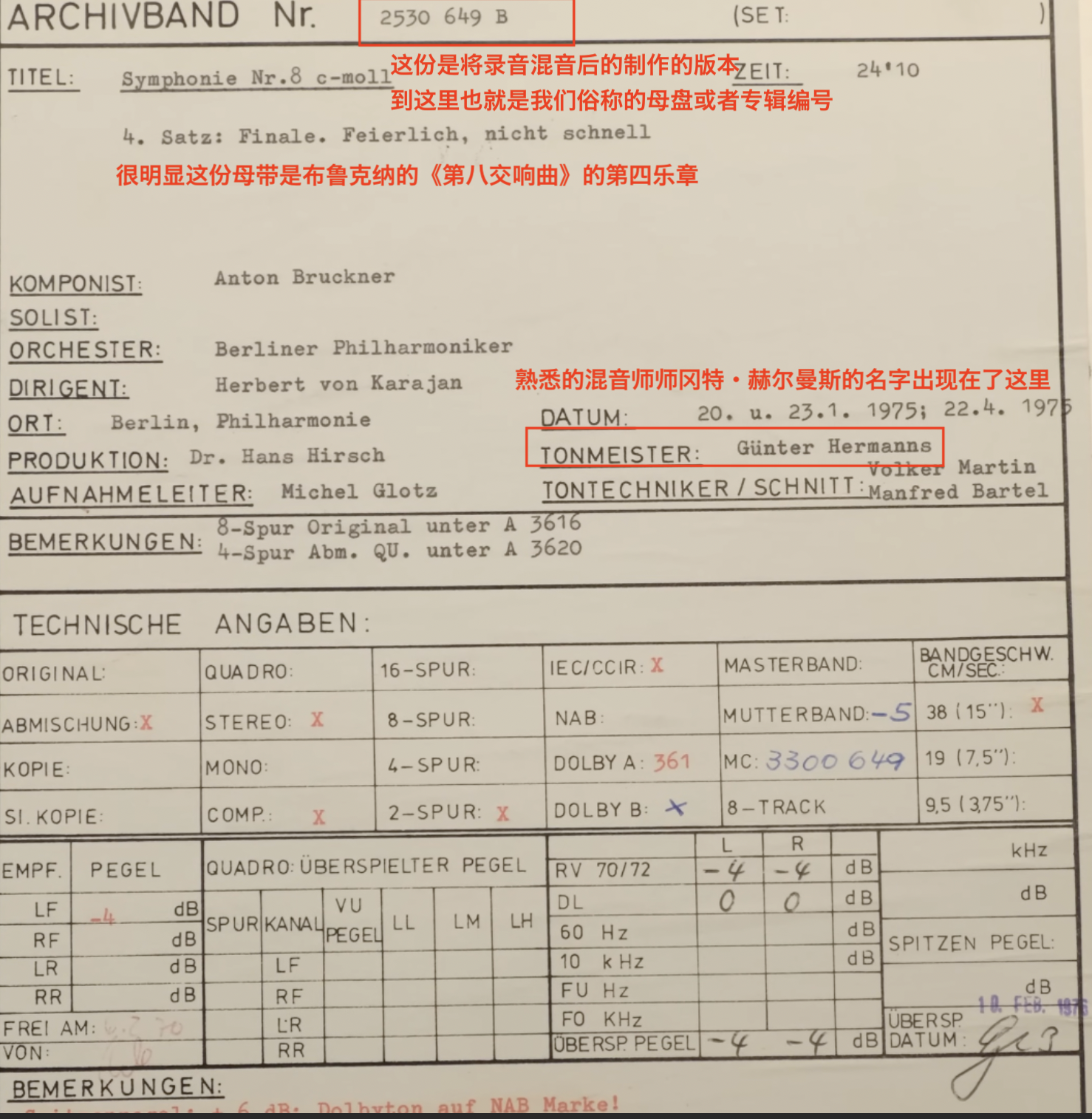 此外视频中还提到了一个极具趣味性的细节:那就是卡拉扬其实是一个技术发烧友,对音质有着极高的要求。他在一封亲笔信中明确表达了对自己录制的布鲁克纳《第四交响曲》(专辑编号 2530 674) 的音质不满,而这一不满并非来自混音,而是唱片物理层面的问题。由于黑胶唱片的刻录方式,在唱片靠近边缘的位置,刻槽线速度较快,导致高频损失和失真现象加剧,影响了最终的回放质量。卡拉扬的建议是将音乐拆分到更多的唱片面,以减少唱片刻录到边缘时的影响,从而提高整体音质。这一做法在后来的发烧黑胶版本中已被广泛应用,以确保更好的音质。然而 DG 出于商业考虑,在当时并未采纳卡拉扬的建议,而是选择了让混音师赫尔曼斯重新制作一个更“保守”的混音版本,以适应当时市场的需求。最终,市场发行的首版黑胶,实际上并非卡拉扬理想中的声音,而是经过妥协后调整的产物。这一事实也正是 DG 近年来决定推出 The Original Source 全模拟再版系列的主要原因之一,即尽可能还原录音母带的原始状态,消除过去因物理介质限制而做出的技术妥协。